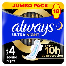 Exigez une bonne nuit de sommeil avec une protection jusqu'à 10 heures : Les serviettes Always Ultra Secure Night (taille 4) avec ailettes sont conçues avec 3 éléments de protection pour vous éviter de vous lever la nuit en cas de fuites ou pour changer votre serviette. Une partie arrière 60% plus large* associée à notre technologie AntiFuites retient les liquides et aide à prévenir les fuites la nuit lors de vos règles. Le système InstantAbsorb absorbe le liquide en quelques secondes et éloigne l'humidité de la peau. Elles possèdent également la technologie OdourLock qui neutralise les odeurs, afin que vous vous sentiez fraîche et propre. Dormez, Always Ultra vous offre une triple protection. Les serviettes sont approuvées par les dermatologues de la Skin Health Alliance. Pour une protection renforcée la nuit, essayez les serviettes Always Ultra Secure Night Extra (taille 5), la protection Always parfaitement adaptée pour la nuit. Trouvez la serviette qui vous va avec Always MyFit, un système de taille personnalisé qui vous aide à trouver la meilleure protection Always pendant vos règles, en fonction de votre flux et de votre taille de lingerie.