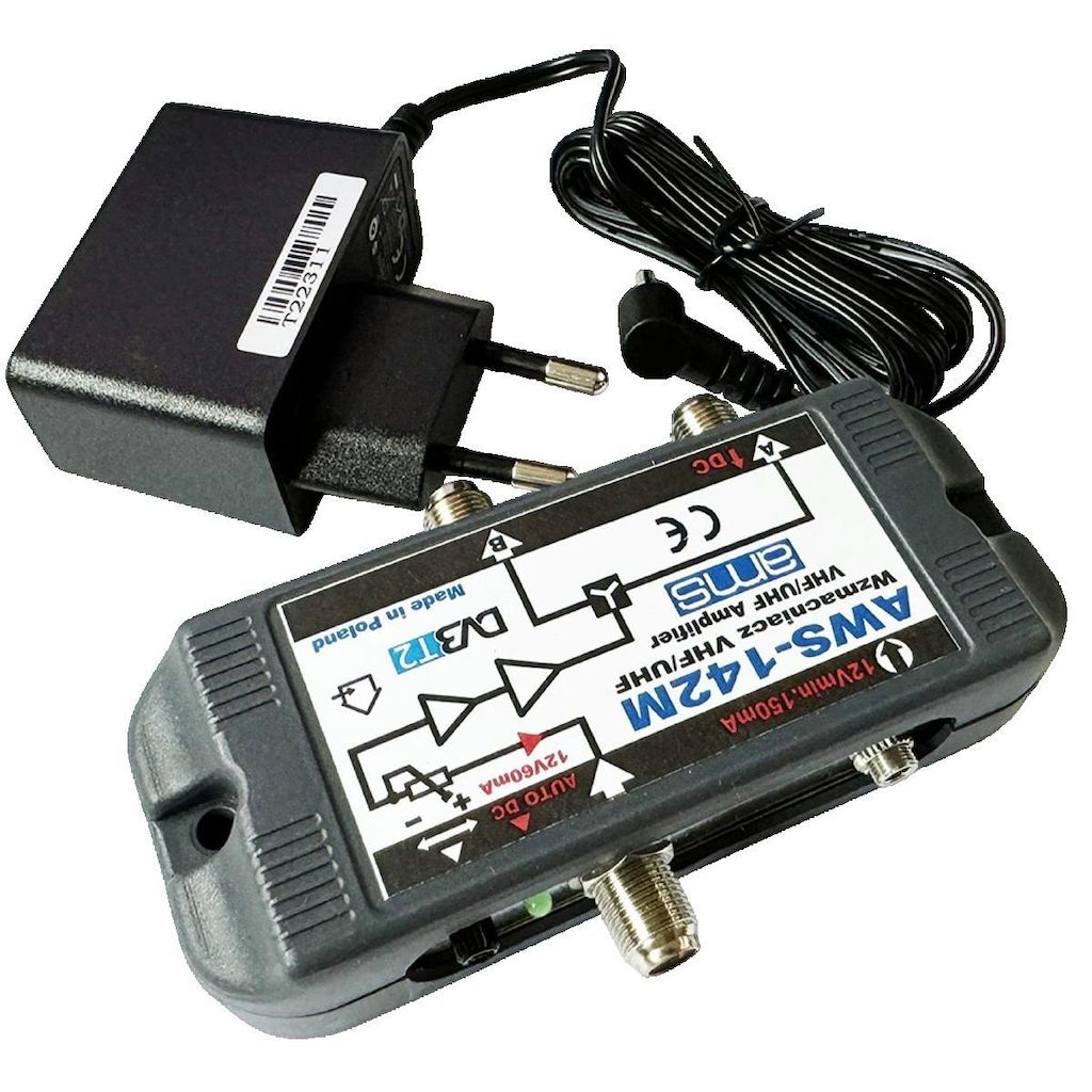 L'amplificateur d'antenne AWS-142M de la marque AMS est conçu pour optimiser le signal de télévision dans votre foyer. Compact et fiable, il assure une excellente répartition du signal avec un gain maximum de 20 dB et un régulateur de gain intégré allant de 0 à 10 dB pour ajuster le niveau selon vos