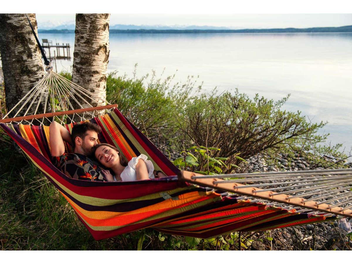 Plongez dans une expérience de détente exceptionnelle avec le hamac Brasilia Amazonas, un symbole intemporel de confort et de bien-être en plein air.