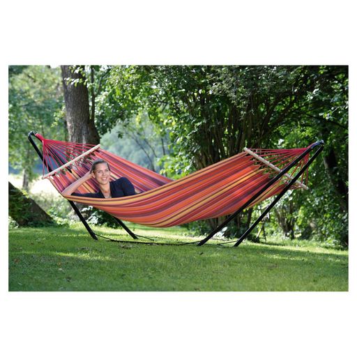 Le hamac avec support métallique BEACH SET de marque AMAZONAS est un appel à la sieste. Grace à ce hamac sur pied, vous allez pouvoir vous détendre dans votre jardin ou sur votre terrasse. Sa structure en acier, recouverte de peinture époxy limite l'effet de l'oxydation et vous offrira longévité et