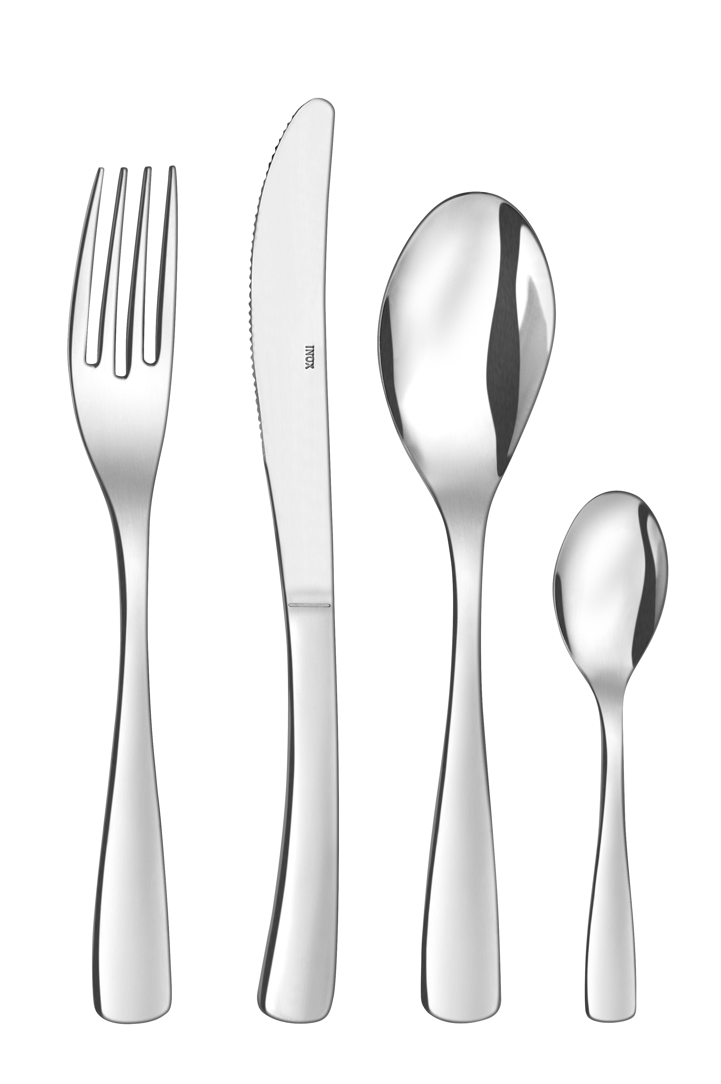 Ménagère 24 pièces en inox MENU composée de 6 fourchettes + 6 couteaux + 6 cuillères à café + 6 cuillères à soupe. Des couverts aux formes farfelues, ultra tendance ! Compatible au lave-vaisselle.