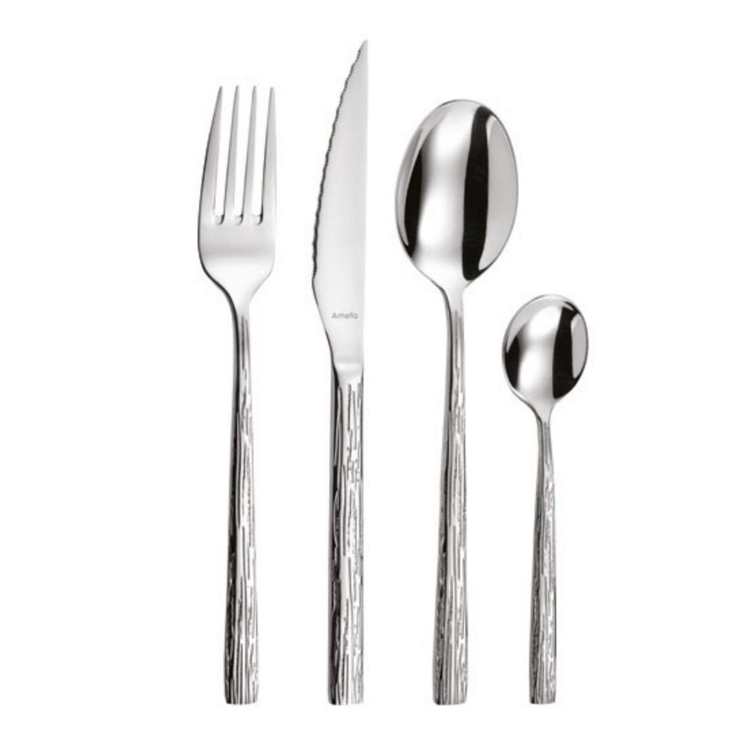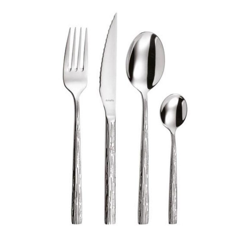 Amefa 145000AF11C40 Ménagère 24 pièces de la collection Cali par Amefa 145000AF11C40. Joli couvert, simple et moderne, réhaussé d'une gravure d'écorce sur les 2 côtés du manche. Le couteau lame steak est parfait pour découper avec précision les viandes les plus coriaces. Amefa est l'un des principau
