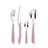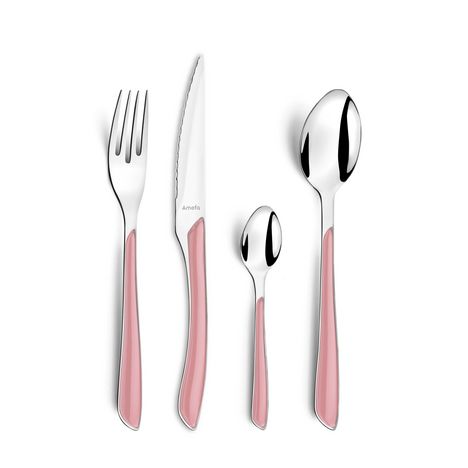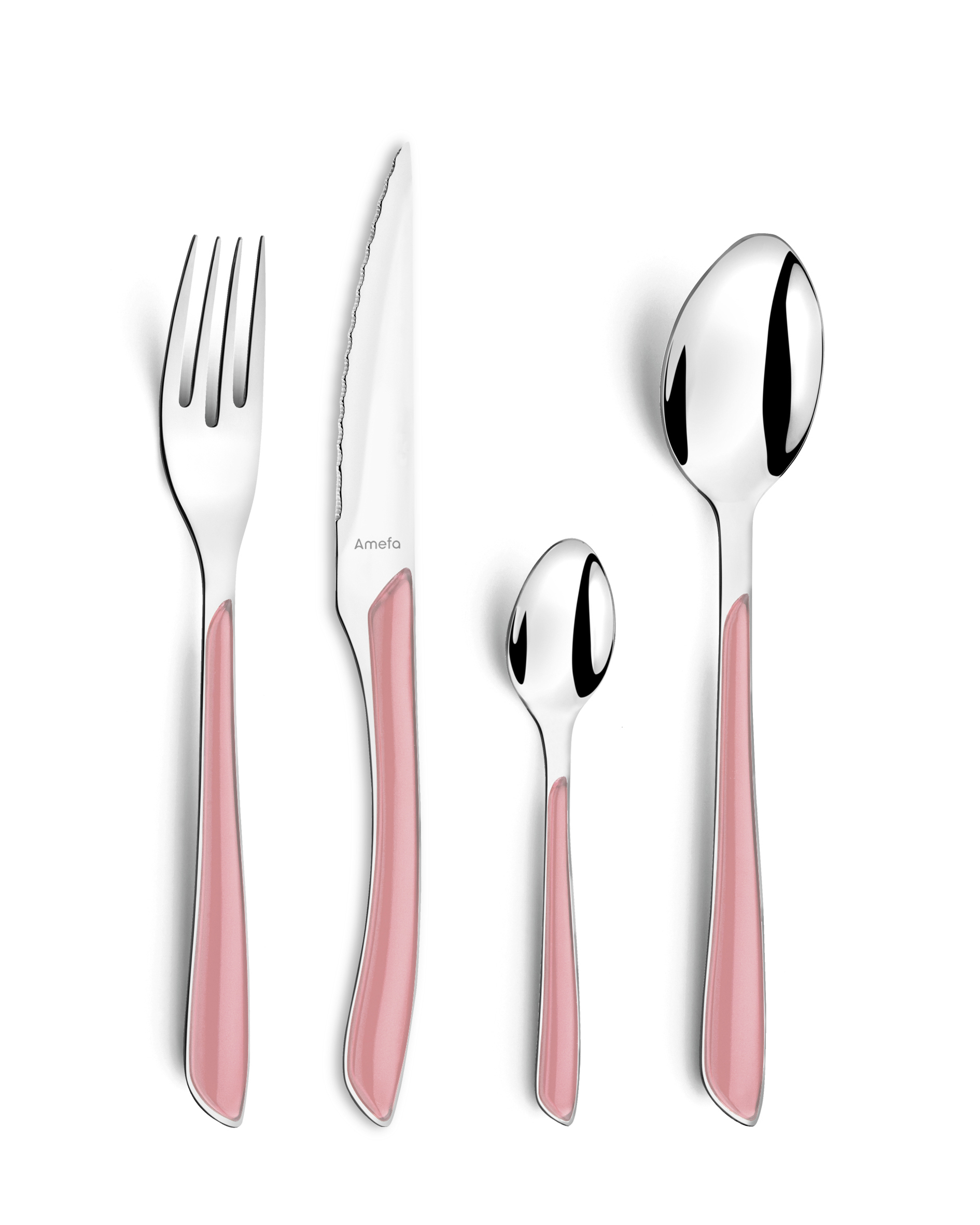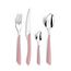 Ménagère 24 pièces rose pastel en inox. Manche en ABS. Composition : 6 couteaux + 6 fourchettes + 6 cuillères + 6 cuillères à café Compatible au lave vaisselle