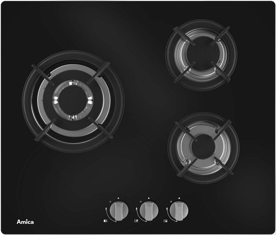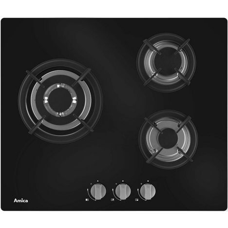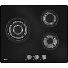 Amica AG3631N Table de cuisson gaz Amica AG3631N avec surface en verre noir. - Type de produit : Table verre.Type de plaque : Gaz.Type d'encastrement : A recouvrement plan de travail.Energie : Gaz.Hotte intégrée : Non.Nbre foyer(s) : 3.Touche(s) sensitive(s) : Non.Type de commande(s) : Manettes.Posi