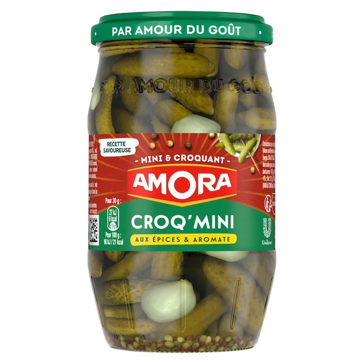 Réveillez vos papilles avec les cornichons Croq'Mini Amora® ! Soigneusement sélectionnés et délicieusement croquants, les cornichons Amora® marient très subtilement les épices et les aromates. Partagez ce qu'il y a de meilleur : des cornichons fins cueillis à la main et soigneusement sélectionnés pour un croquant irrésistible. Apportez une touche de croquant et de fraîcheur à vos raclettes, salades d'été ou plateaux de charcuterie avec les cornichons Amora. Le cornichon Amora est le condiment indispensable pour vos salades. Découvrez toute la variété des cornichons Amora® : minis, fins ou extra-fins selon vos envies. Parce qu'il est important pour nous de limiter notre impact environnemental, notre bocal de 210 g en verre est entièrement recyclable ! Aidez-nous à réduire les déchets en le recyclant. Présente dans le cœur des Français depuis 1919, Amora® est reconnue et appréciée pour son savoir-faire et la qualité de ses produits. La marque séduit chaque année avec des nouveautés authentiques, pleines de goût et originales. Chez Amora®, nous sommes conscients de l'impact de notre activité sur l'environnement et, en tant qu'acteur majeur sur le marché de l'alimentaire, nous nous engageons à plusieurs niveaux pour agir et produire de manière durable. Réalisez des recettes faciles et gourmandes, et réinventez vos plats en leur donnant toujours plus de goût avec Amora®. Sur le bord de l'assiette, dans vos sandwichs, ou à chaud, les produits Amora® assaisonneront tous vos plats et relèveront les saveurs de votre cuisine. Découvrez ainsi le plaisir de partager de délicieux repas en famille ou entre amis. Retrouvez tous les produits Amora® et des idées recettes sur www.amora.fr. Vous régalerez les grands comme les petits, pour le plaisir de toutes les papilles.