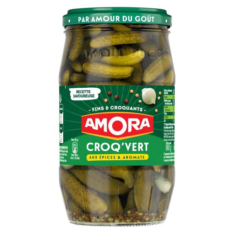 Réveillez vos papilles avec les cornichons Croq'vert Amora ! Soigneusement sélectionnés et délicieusement croquants, les cornichons Amora marient très subtilement 6 épices et des aromates. Partagez ce qu'il y a de meilleur : des cornichons -fins cueillis à la main et soigneusement sélectionnés pour un croquant irrésistible. Apportez une touche de croquant et de fraîcheur à vos raclettes, salades d'été ou plateaux de charcuterie avec les cornichons Amora. Le cornichon Amora est le condiment indispensable pour vos salades. Découvrez toute la varitété des cornichons Amora : minis, fins ou extra-fins selon vos envies. Parce qu'il est important pour nous de limiter notre impact environnemental, notre bocal de 540 g en verre est 100% recyclable ! Aidez-nous à réduire les déchets en le recyclant. Présente dans le cœur des Français depuis 1919, Amora est reconnue et appréciée pour son savoir-faire et la qualité de ses produits. La marque séduit chaque année avec des nouveautés authentiques, pleines de goût et originales. Chez Amora, nous sommes conscients de l'impact de notre activité sur l'environnement et, en tant qu'acteur majeur sur le marché de l'alimentaire, nous nous engageons à plusieurs niveaux pour agir et produire de manière durable. Réalisez des recettes faciles et gourmandes et réinventez vos plats en leur donnant toujours plus de goût avec Amora. Sur le bord de l'assiette, dans vos sandwichs, ou à chaud, les produits Amora assaisonneront tous vos plats et relèveront les saveurs de votre cuisine. Découvrez ainsi le plaisir de partager de délicieux repas en famille ou entre amis. Retrouvez tous les produits Amora et des idées recettes sur www.amora.fr. Vous régalerez les grands comme les petits, pour le plaisir de toutes les papilles !