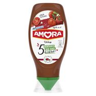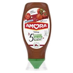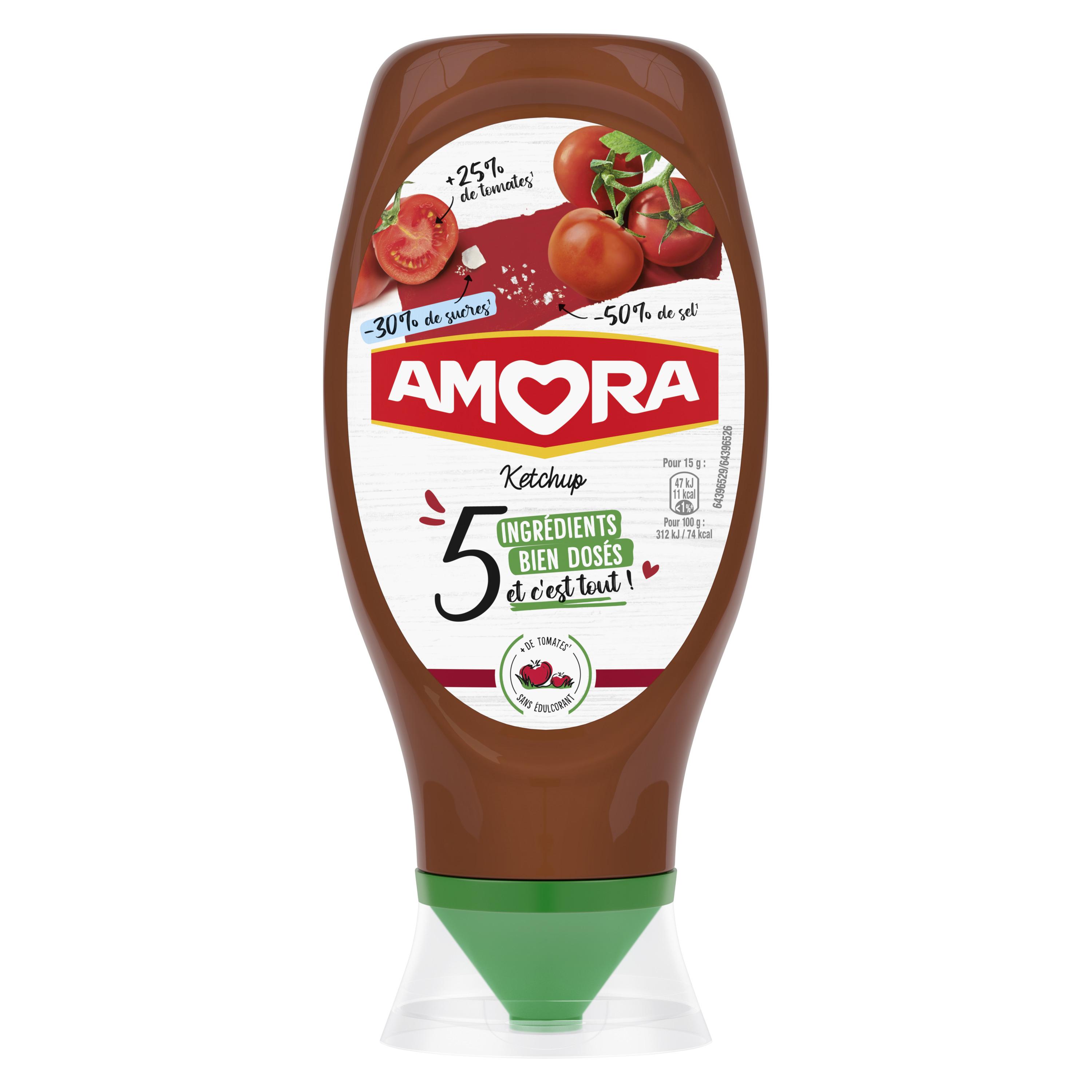 Le Ketchup Amora® 5 Ingrédients : un Ketchup préparé avec 5 ingrédients bien dosés et c'est tout ! Une recette tout simplement très gourmande ! Des tomates, du vinaigre d'alcool, du sucre, un peu de sel, un extrait d'épices et c'est tout ! La recette de ce ketchup Amora® contient 25% de tomates¹ en plus, 30% de sucres en moins¹ et 50% de sel en moins¹. Elle est sans conservateurs, ni édulcorants. Bref, une recette gourmande et sans chichis pour toute la famille. Notre recette de Ketchup 5 ingrédients conviendra à toute la famille, petits et grands, et accompagnera à merveille tous vos plats, que vous soyez team poulet ou haricots verts. Pour être encore plus pratique et utilisée par petits et grands, notre bouteille plastique a un bouchon conçu pour rester toujours propre. Réalisez des recettes faciles et gourmandes et réinventez vos plats en leur donnant toujours plus de goût avec Amora®. Sur le bord de l'assiette, dans vos sandwichs, ou à chaud, les produits Amora® assaisonneront tous vos plats et relèveront les saveurs de votre cuisine. Découvrez ainsi le plaisir de partager de délicieux repas en famille ou entre amis. Retrouvez tous les produits Amora ® et des idées recettes sur www.amora.fr. Vous régalerez les grands comme les petits, pour le plaisir de toutes les papilles ! ¹Par rapport à la moyenne des Tomato Ketchup du marché.