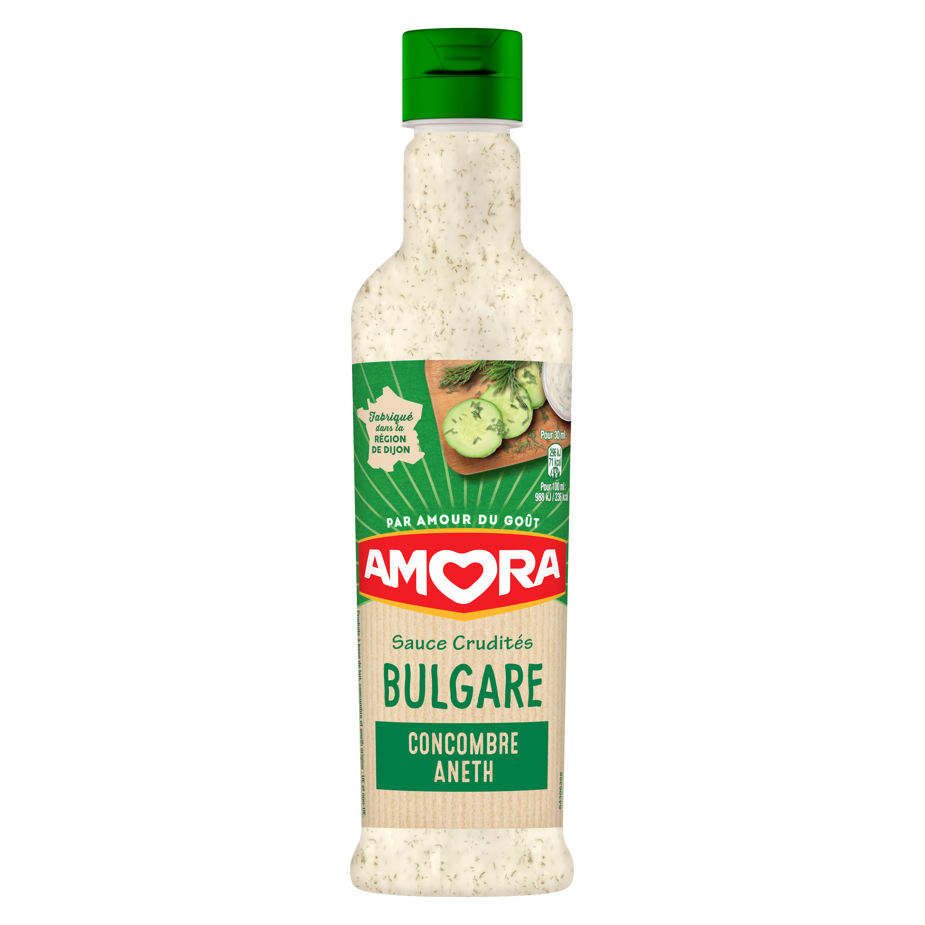 Profitez de tout le plaisir d'une salade avec la Sauce Bulgare Amora® en bouteille de 380 ml. Une recette de sauce crudités au goût frais pour plaire à toute la famille, petits et grands. La Sauce Bulgare Concombre Aneth accompagnera parfaitement vos légumes à croquer, vos salades de pommes de terre ainsi que vos salades au saumon fumé et avocat. Notre savoureuse sauce crudités est fabriquée en France. Partagez ce qu'il y a de meilleur. Un assaisonnement préparé avec amour, disponible dans un format familial de 380 ml ! Aidez-nous à réduire les déchets en le triant. Présente dans le cœur des Français depuis 1919, Amora® est reconnue et appréciée pour son savoir-faire et la qualité de ses produits. La marque séduit chaque année avec des recettes pleines de goût, simples et originales. Réalisez des recettes faciles et gourmandes et réinventez vos plats en leur donnant toujours plus de goût avec Amora®. Sur le bord de l'assiette, dans vos sandwichs, ou à chaud, les produits Amora® assaisonneront tous vos plats et relèveront les saveurs de votre cuisine. Découvrez ainsi le plaisir de partager de délicieux repas en famille ou entre amis. Retrouvez tous les produits Amora® et des idées recettes sur www.amora.fr. Vous régalerez les grands comme les petits, pour le plaisir de toutes les papilles !