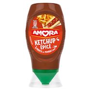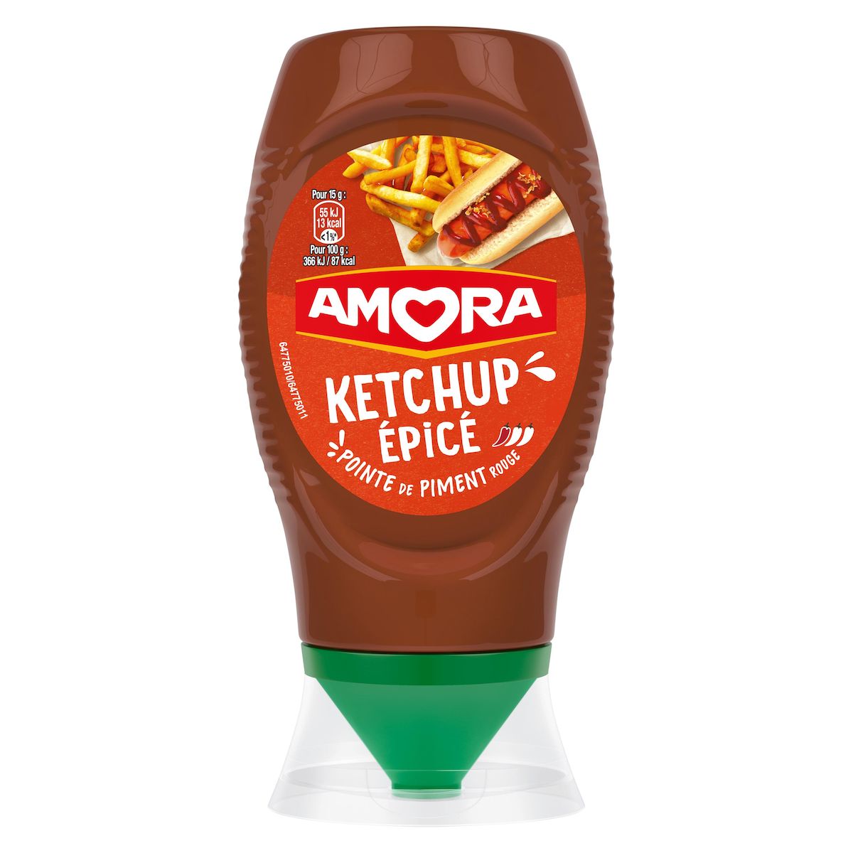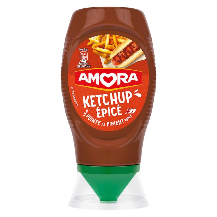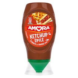 Découvrez le Ketchup Épicé Amora® en flacon souple de 275 g. Une recette unique faite à partir de tomates mûries en plein champ et sélectionnées pour leur qualité et leur saveur naturelle ; relevée avec une note légèrement épicée apportée par le piment rouge de Cayenne. Cette sauce est réalisée avec des ingrédients sélectionnés avec soin et des tomates issues de coopératives italiennes utilisant l'agriculture durable. Régalez-vous avec les ketchups Amora ® et rehaussez le goût de tous vos plats. Ce condiment est idéal pour vos viandes grillées au barbecue, vos frites, vos légumes ou encore vos pâtes. Parce qu'il est important pour nous de limiter notre impact environnemental, notre emballage comporte au moins 63 % de matières recyclées. Aidez-nous à réduire les déchets plastiques en la recyclant. Pour être encore plus pratique et utilisé par petits et grands, le bouchon est conçu pour rester toujours propre. Présente dans le cœur des Français depuis 1919, Amora® est reconnue et appréciée pour son savoir-faire et la qualité de ses produits. La marque séduit chaque année avec des nouveautés, pleines de goût et originales. Réalisez des recettes faciles et gourmandes, et réinventez vos plats en leur donnant toujours plus de goût avec Amora®. Sur le bord de l'assiette, dans vos sandwichs, ou à chaud, les produits Amora® assaisonneront tous vos plats et relèveront les saveurs de votre cuisine. Découvrez ainsi le plaisir de partager de délicieux repas en famille ou entre amis. Retrouvez toutes les astuces et les recettes gourmandes Amora® : vous régalerez les grands comme les petits, pour le plaisir de toute la famille. Avec les condiments Amora®, partagez plus qu'un repas !