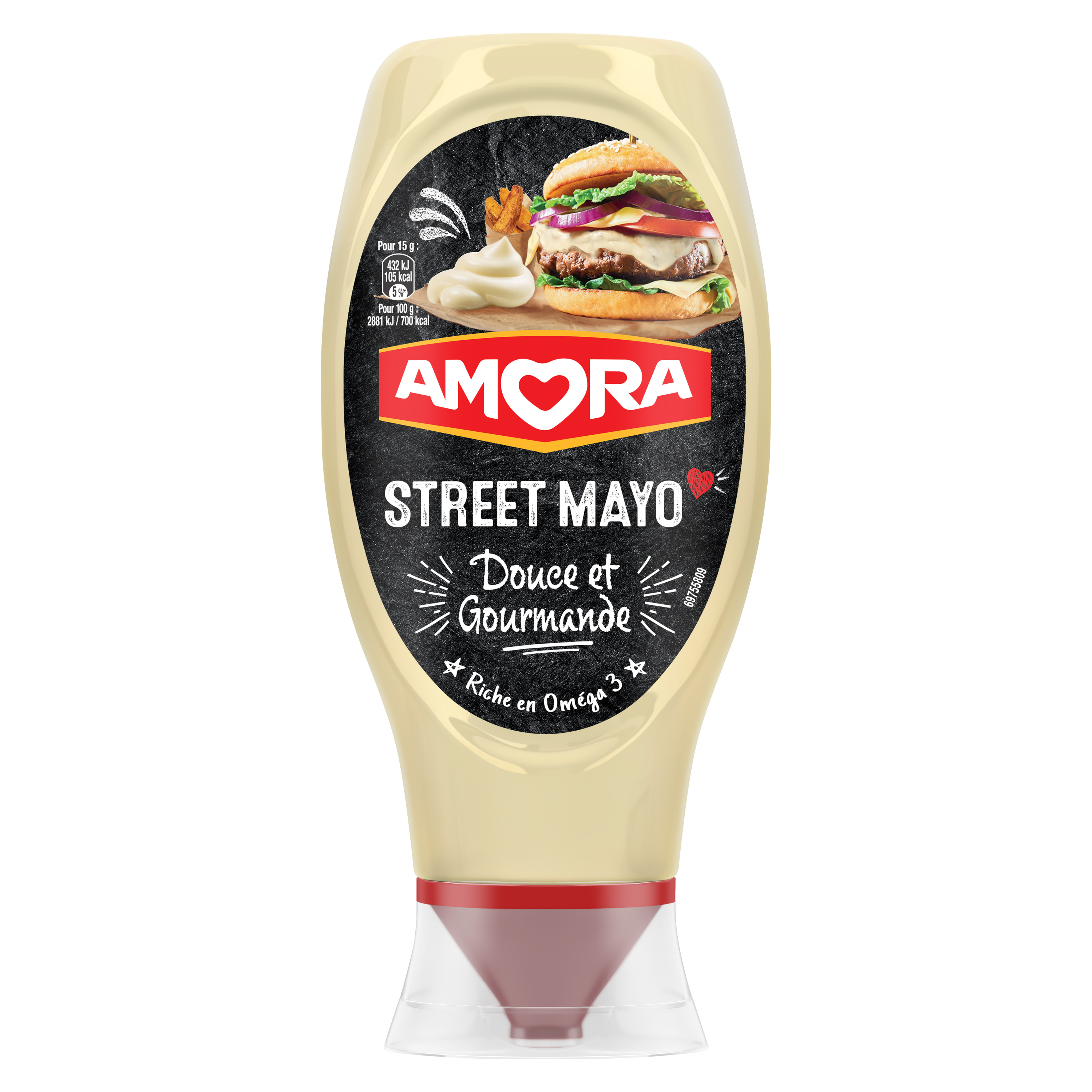La nouvelle Street Mayo Amora, c'est une délicieuse mayonnaise pour accompagner tout en douceur et gourmandise les plats les plus incontournables de la cuisine de rue – burgers, sandwichs, frites et bien d'autres... et faire plaisir à toute la famille ! Si cette mayonnaise est si bonne, c'est parce qu'elle est composée d'ingrédients de qualité : des œufs et de l'huile de colza riche en oméga 3. Notre mayonnaise Amora est onctueuse, gourmande et douce. Elle est à conserver au réfrigérateur après ouverture. Puisqu'il est important pour nous de limiter notre impact environnemental, le flacon souple de 398 g de notre mayonnaise est entièrement recyclable. Présente dans le cœur des Français depuis 1919, Amora est reconnue et appréciée pour son savoir-faire et la qualité de ses produits. La marque séduit chaque année avec des recettes pleines de goût, simples et originales. Réalisez des recettes faciles et gourmandes et réinventez vos plats en leur offrant toujours plus de goût avec Amora. Sur le bord de l'assiette, dans vos sandwichs, ou à chaud, les produits Amora assaisonneront tous vos plats (salades, poissons, viandes, légumes...) et relèveront les saveurs de votre cuisine. Découvrez ainsi le plaisir de partager de délicieux repas en famille ou entre amis. Vous régalerez les grands comme les petits, pour le plaisir de toutes les papilles !