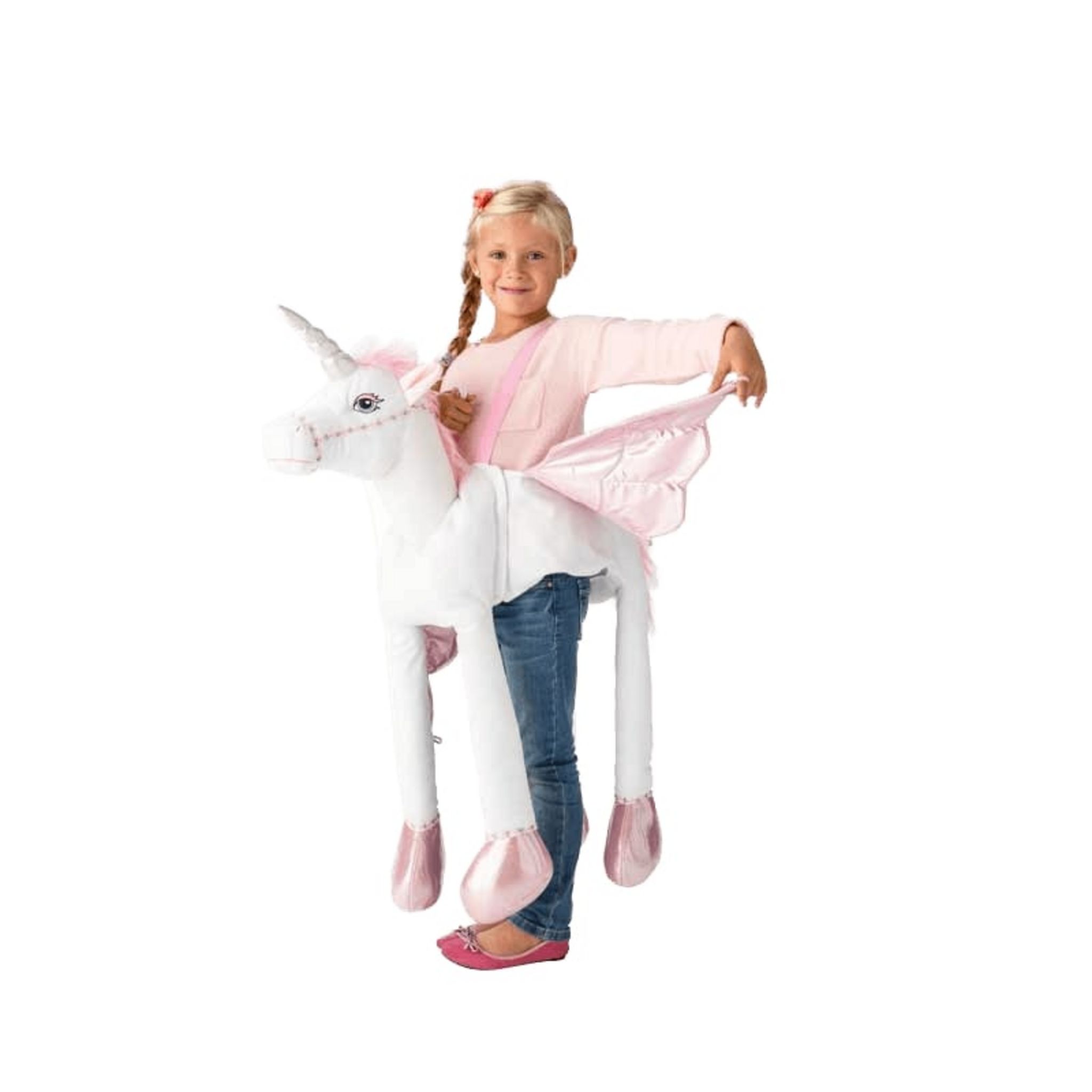 Ce déguisement donnera réellement l'impression que votre enfant chevauche le plus féerique des animaux : la licorne. Ce costume à bretelle ajustable est composé d'une licorne blanche et rose à la jolie corne argentée et aux ailes qui se déploient !
