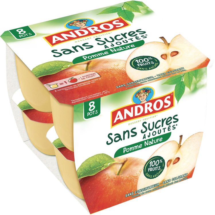 La meilleure chose qui puisse arriver à un fruit bien mûr ? C'est d'être sélectionné par ANDROS. Découvrez le dessert fruitier pomme 100% fruitssans sucres ajoutés*: une recette sans arôme sans colorant** et sans conservateur pour retrouver le vrai goût des fruits. (*Contient des sucres naturellement présents dans les fruits).(**conformément à la réglementation). Andros, la force du fruit !
