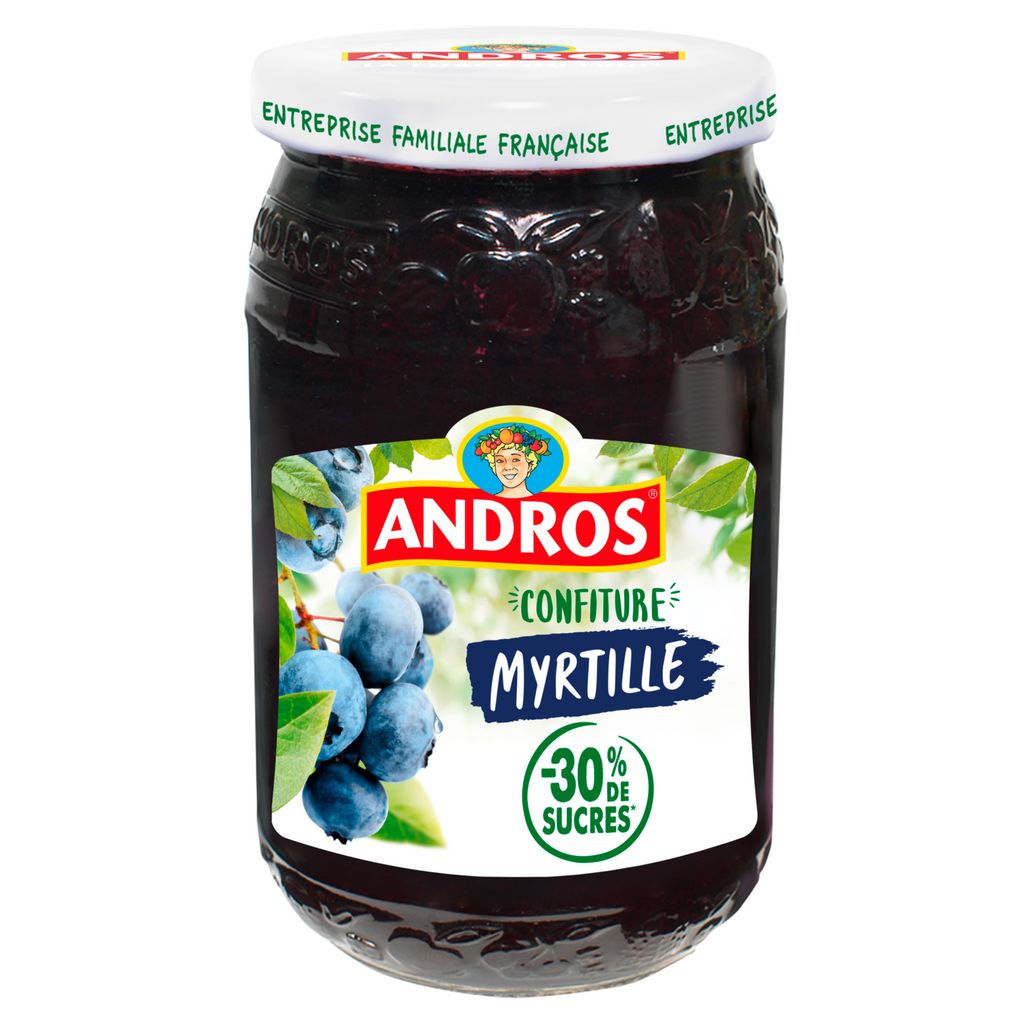 Confiture Extra de Myrtilles allégée en sucres, soit 30% de sucres en moins qu'une confiture traditionnelle.