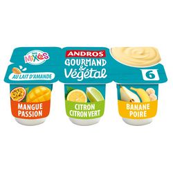 Si vous aimez les yaourts aux fruits mixés, vous succomberez au plaisir de cette version végétale, à retrouver en panaché pour varier les plaisirs. Un mixe de bon lait d'amande avec des fruits exotiques (mangue passion, citron citron vert, banane poire). Il est faible en matières grasses, source de vitamines ET de calcium : il convient aux personnes intolérantes au lactose. Enfin un dessert végétal vraiment gourmand !