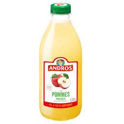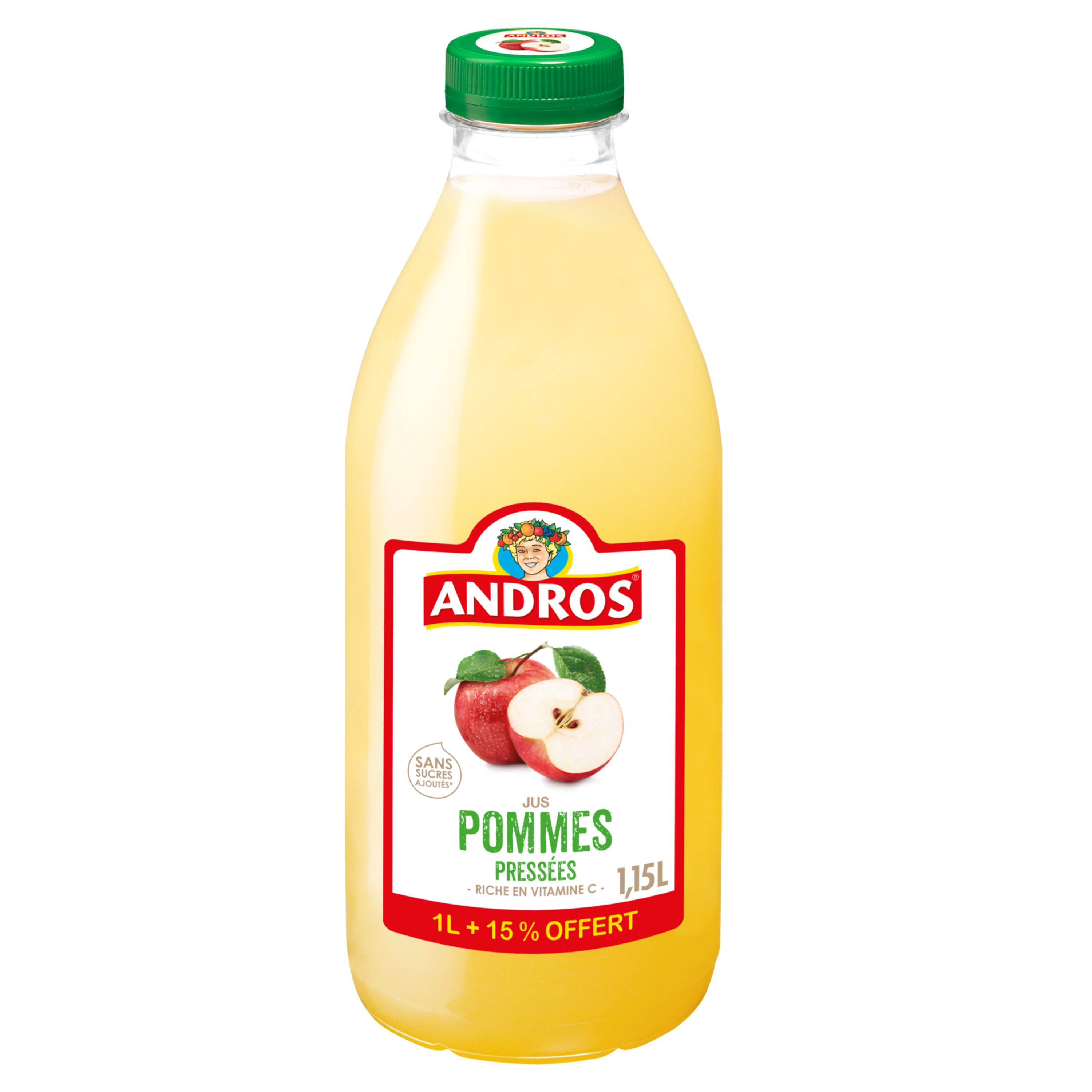 La meilleure chose qui puisse arriver à un fruit bien mûr ? C'est d'être sélectionné par ANDROS. Découvrez notre jus de pommes pressées sans sucres ajoutés (conformément à la réglementation des jus de fruits), source de vitamine C, au goût doux et léger qui plaira à toute la famille dans un format généreux 1L + 15% Offert. Andros, tant de bon à transmettre !