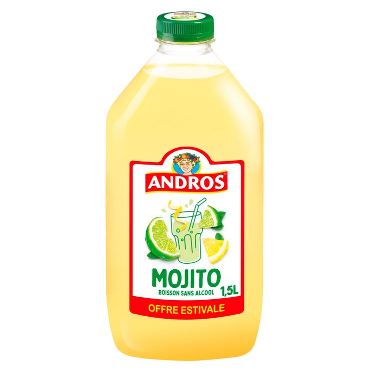 Mojito cocktail sans alccol Envie de fraîcheur ? Les fruits cueillis à maturité vous font craquer ? Savourez le bon goût des fruits avec les boissons ANDROS ! Andros vous offre une boisson rafraîchissante inspirée du fameux cocktail, le Mojito, le tout sans alcool. Andros, La Force du Fruit !