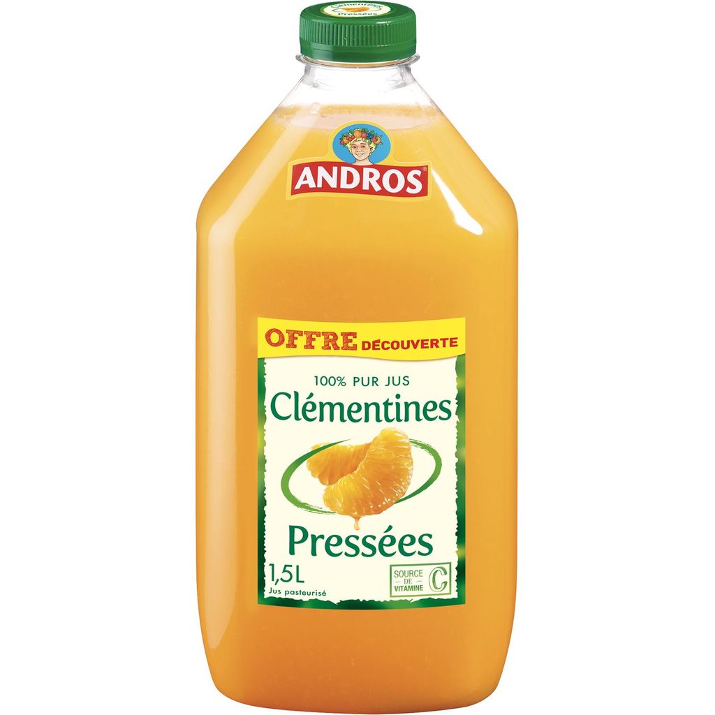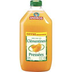 100% pur jus de clémentines. La meilleure chose qui puisse arriver à un fruit bien mûr ? C'est d'être sélectionné par ANDROS. 100% purs jus, sans sucre ajouté (conformément à la réglementation en vigueur). Un jus de clémentines tout en douceur qui plaira à toute la famille. Recette sans pulpe et source de vitamine C. Andros, La Force du Fruit !