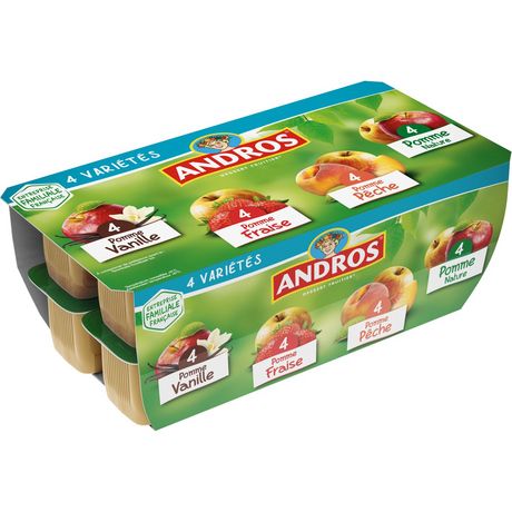 La meilleure chose qui puisse arriver à un fruit bien mûr ? C'est d'être sélectionné par ANDROS. Découvrez le dessert fruitier Andros : 4 variétés* pour régaler toute la famille. (*sans conservateur, sans colorant, conformément à la réglementation). Andros, la force du fruit ! Spécialité de pommes à la vanille. Dessert de pommes et de fraises. Spécialité de pommes et de pêches. Dessert de pommes.
