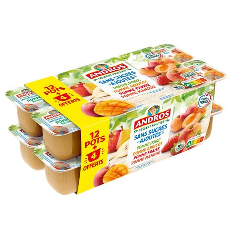 4 Spécialités de pommes et d'abricots sans sucres ajoutés, aromatisées. 4 Spécialités de pommes et de fraises sans sucres ajoutés, aromatisées. 4 Spécialités de pommes et de poires sans sucres ajoutés, aromatisées. 4 Purées de pommes et de mangues sans sucres ajoutés.