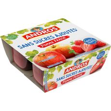 La meilleure chose qui puisse arriver à un fruit bien mûr ? C'est d'être sélectionné par ANDROS. Découvrez le dessert fruitier pomme fraise 100% fruits sans sucres ajoutés*: une recette sans arôme, sans colorant** et sans conservateur pour retrouver le vrai goût des fruits. (*Contient des sucres naturellement présents dans les fruits).(**conformément à la réglementation). Andros, la force du fruit ! Spécialité de pommes, de fraises et de cassis sans sucres ajoutés. * contient des sucres naturellement présents dans les fruits