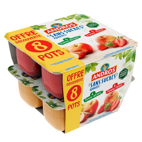 Purée de pommes sans sucres ajoutés. Spécialité de pommes et de fraises sans sucres ajoutés, aromatisée.