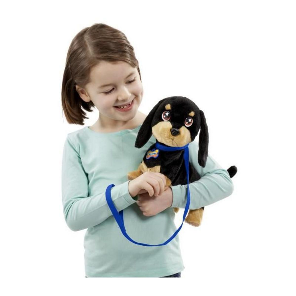 Waggles en balade d'ANIMAGIC est une peluche interactive conçue pour émerveiller les enfants dès 3 ans. Ce teckel mécanisé reproduit les comportements d'un vrai chien : il marche, aboie et remue la queue grâce à un système ingénieux. Son design réaliste et doux invite aux câlins tout en stimulant l'imaginaire.