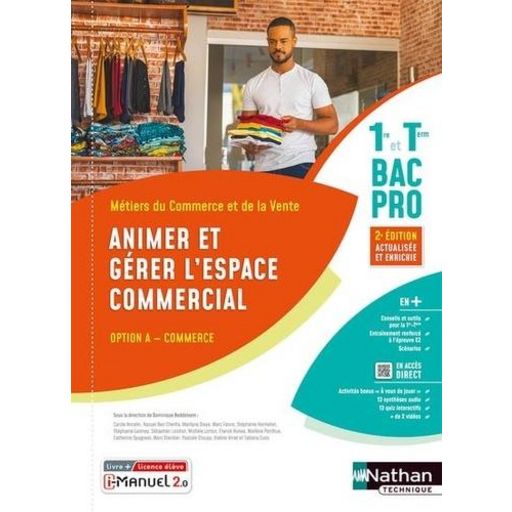Cet ouvrage est conforme au référentiel, et traite les compétences du bloc 4 option A du Bac Pro Métiers du Commerce et de la Vente. Il est proposé au choix en livre papier + licence numérique i-Manuel ou en 100% numérique i-Manuel. En version imprimée, cet ouvrage propose en complément une licence numérique i-Manuel 2. 0, la solution pour mettre les élèves en activité sur ordinateur ou sur tablette. >> Les infos pratiques sur le i-Manuel 2. 0 à découvrir ci-dessous Nouveau dans cette édition 2023 : - Une grille d'autoévaluation , à remplir au fur et à mesure, permet à l'élève de suivre sa progression. - Un dossier Conseils et outils pour la 1re/Tle est disponible en début d'ouvrage (créer son profil LinkedIn, rédiger son projet de formation motivé sur Parcoursup...). - Un carnet de bord du chef-d'oeuvre est proposé pour créer, suivre et présenter son projet à l'aide d'outils numériques. - Les missions ou applications qui font appel à des compétences Pix sont balisées. - En plus, accessibles par QR Codes : - Des activités bonus A vous de jouer pour favoriser l'animation de la alte (jeux de rôle, quiz, etc.) , - Des séquences de co-intervention Français et Mathématiques , - Des questions supplémentaires qui font le lien avec le programme d'Economie-Droit , - Des synthèses audio et des quiz interactifs. Structure d'un dossier - Une vidéo d'ouverture pour une première découverte du thème. - Des activités proposées sous forme de missions : - dans des entreprises réelles ou réalistes de secteurs variés (tourisme, commerce, services à la personne, transports, banque,...) , - avec des consignes sous forme de dialogue, mail, message écrit ou oral pour mettre en oeuvre les compétences et les notions du dossier. - Une synthèse active adaptée à tous les types de mémorisation : schéma, audio, texte. - Des applications progressives pour retravailler les compétences dans de nouveaux contextes. Scénarios Ils permettent de croiser les compétences et de les travailler de manière active, par groupe, avec des supports informatiques et des travaux à réaliser oralement. Préparation à l'examen Deux études de cas sont proposées dans cet ouvrage pour préparer l'épreuve écrite E2. On retrouve pour chacune des conseils d'assimilation des consignes pour compenser l'absence d'annexe dans les sujets d'examen.