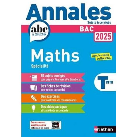 Les Annales ABC du BAC pour réviser et préparer l'épreuve de Mathématiques Terminale du Bac 2025. - 80 sujets corrigés pour préparer l'épreuve et le Grand oral. - Des fiches de révisions pour retenir l'essentiel. - Des exercices pour contrôler ses connaissances. - Des aides pas à pas et la méthode en contexte + Rédigé par des enseignants ! + Annales ABC du BAC 2025 Mathématiques Terminale - Enseignement de spécialité Conforme aux programmes du Bac Une nouvelle formule pour préparer avec succès l'épreuve finale du nouveau Bac ! Les épreuves du nouveau Bac expliquées. Les bonnes méthodes à acquérir pour réussir. Des rappels de cours, des QCM et des exercices pour faire le point. Des sujets pas à pas avec des corrigés expliqués. Des sujets de Bac comme à l'examen pour s'exercer. Un cahier spécial Grand oral.