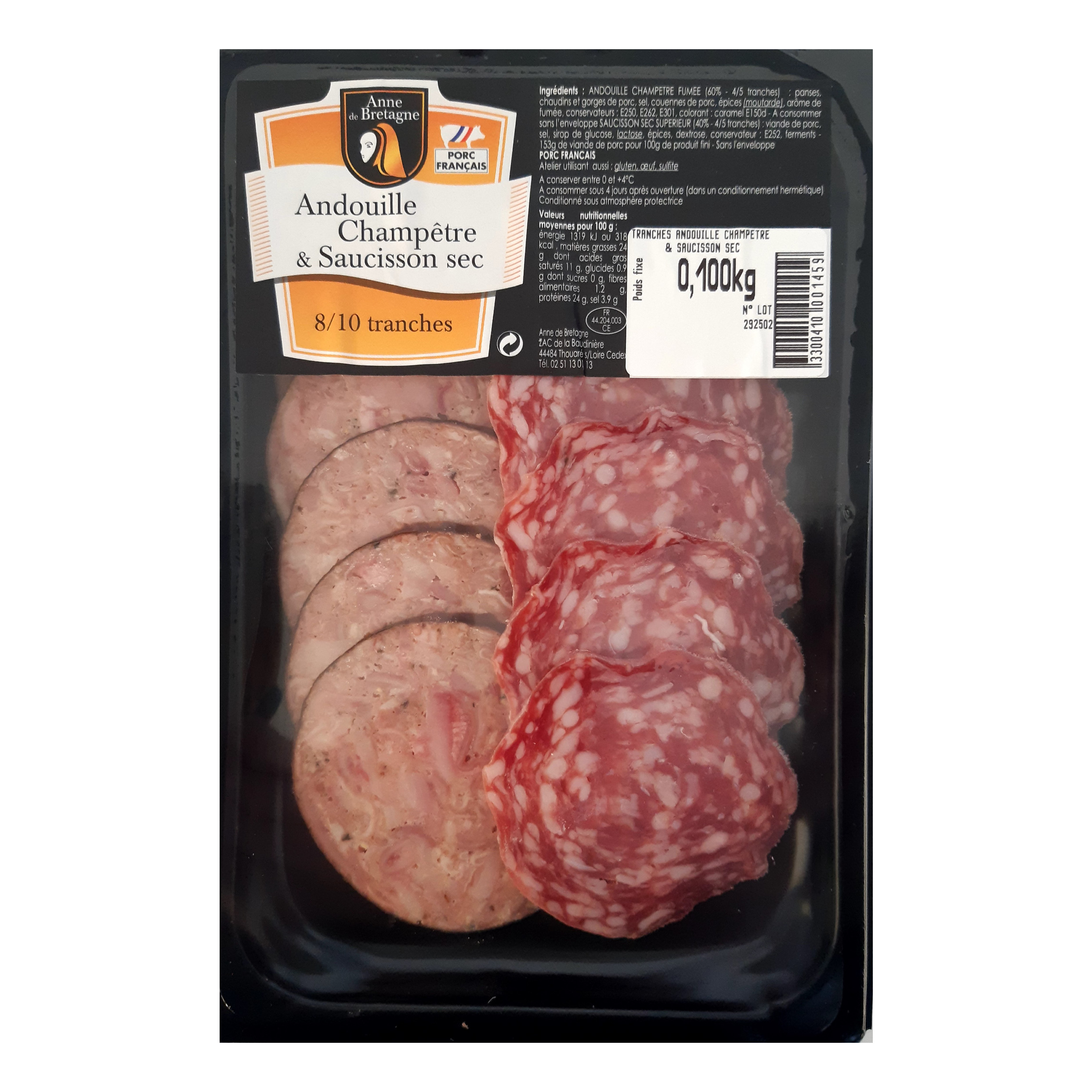 ANDOUILLE CHAMPETRE (60% - 4/5 tranches) : panses, chaudins et gorge de porc, sel, couenne de porc, épices (MOUTARDE), conservateurs : E262, E301, arôme de fumée, colorant : caramel E150d (SULFITES), conservateur : E250 – A consommer sans le boyau collagénique.Fumée au bois de hêtre