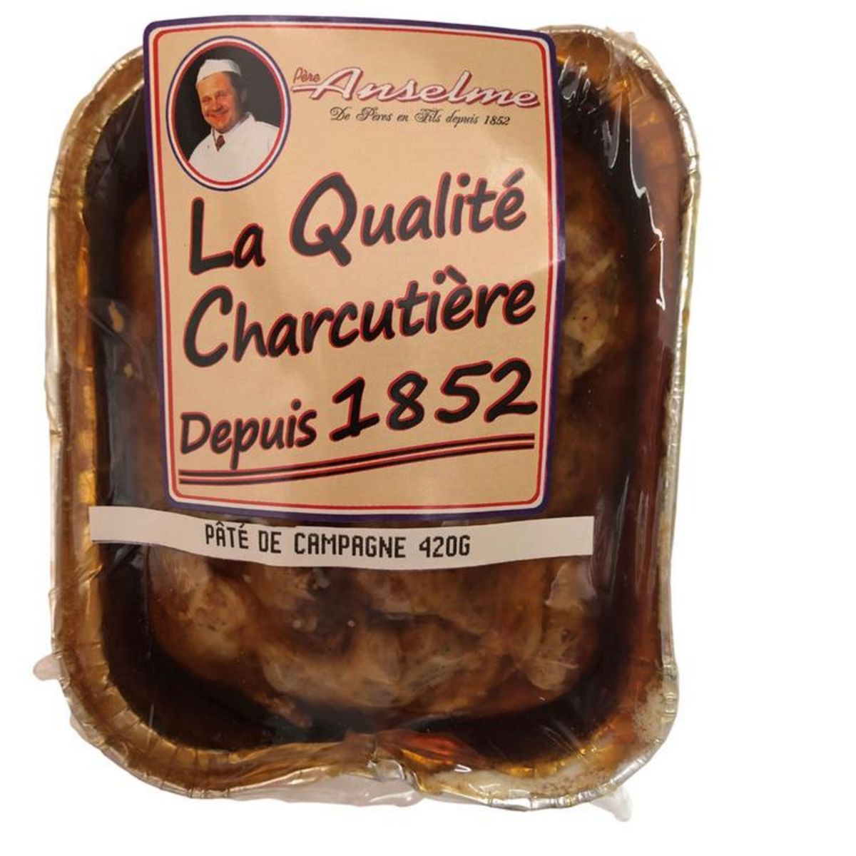 Ingrédients : Gorge et foie de porc origine France, OEUF, saumure (eau, sel, dextrose, sirop de glucose, saccharose, conservateur E250, antioxydant E301, arôme naturel), dextrine de blé, plasma de porc, sel, échalote, Macardan modifié, Rhum modifié, Armagnac modifié, persil, épices, ail, acidifiants E316, E330. Décor : gelée (gélatine de porc (SULFITES), sel, épaississants : E407 et E415, dextrose, concentré (carottes caramélisées), arôme naturel), crépine de porc.