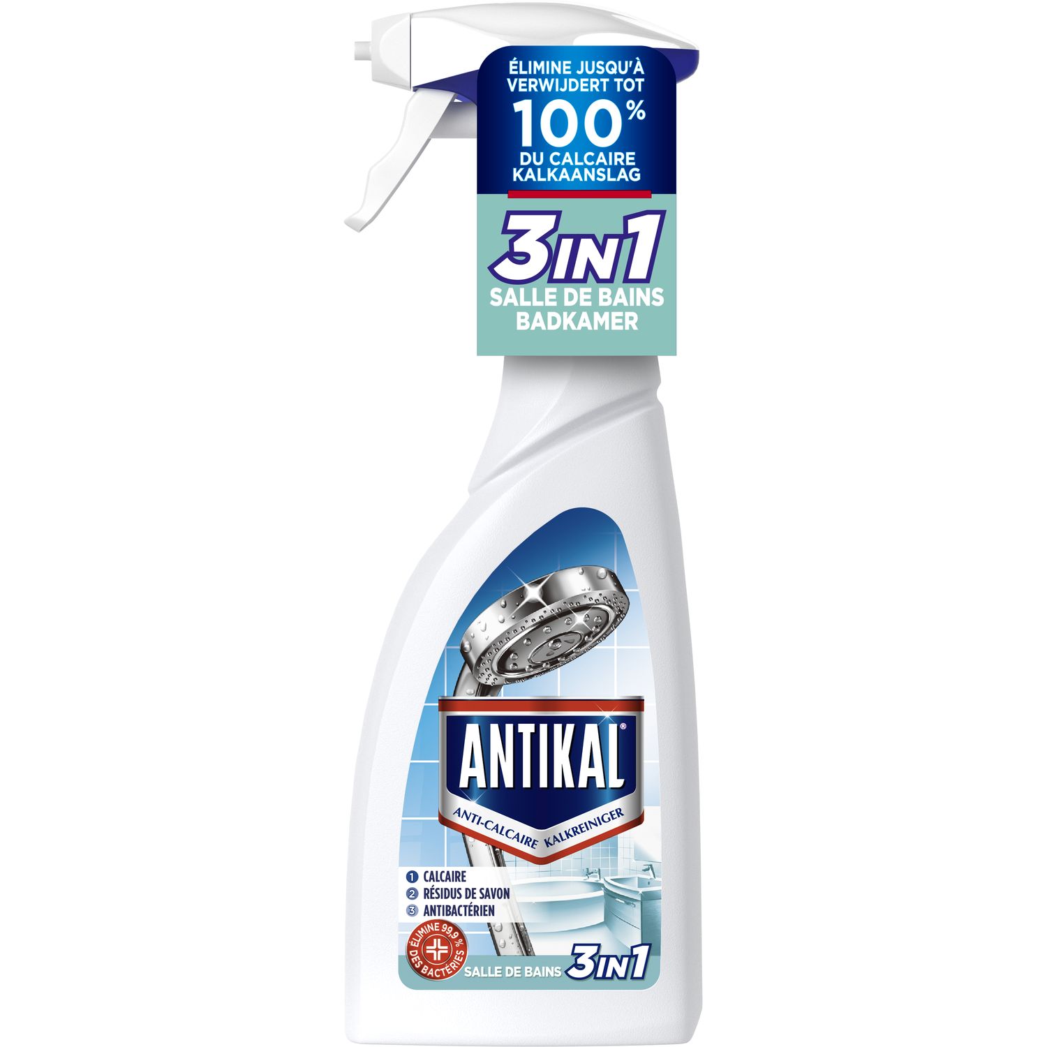 Antikal Spray Anti-Calcaire 3-En-1 Salle De Bains 500 ML Le spray 3 en 1 pour salle de bains Antikal élimine le calcaire, les restes de savon et les traces d’eau, mais aussi 99,9 % des bactéries pour une hygiène en profondeur. Idéal pour une utilisation régulière dans votre salle de bains, il rend les surfaces éclatantes de propreté au quotidien. Antikal Ce spray est idéal pour les surfaces verticales. Il vous garantit une propreté impeccable et une brillance longue durée. Sa formule spéciale forme une barrière pour éviter le retour des traces d’eau, même dans les régions à eau dure. Sa formule respecte vos surfaces permet d’utiliser ce spray au quotidien pour nettoyer une multitude d’espaces exposés à l’eau, des robinets aux carrelages.
