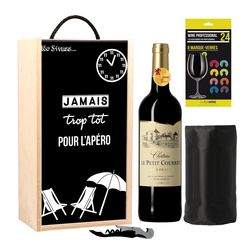 Coffret cadeau original contenant 1 housse rafraichissante, 1 tire-bouchon, 8 marque-verre et 1 bouteille AOC Bordeaux 2023 Médaille d'Or à Lyon