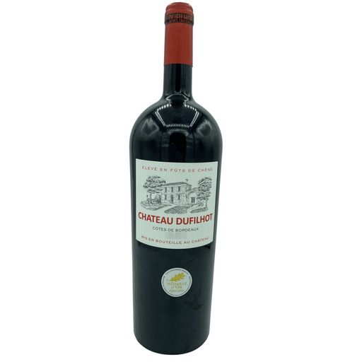 Le magnum du Château Dufilhot est un vin rouge de l'AOP Côtes de Bordeaux parfait pour les grandes tablées. Ce Bordeaux convivial et fruité est dominé par des arômes de fruits rouges, avec une note de cèdre. Sa souplesse en fait un excellent choix pour accompagner les volailles et les fromages, et s
