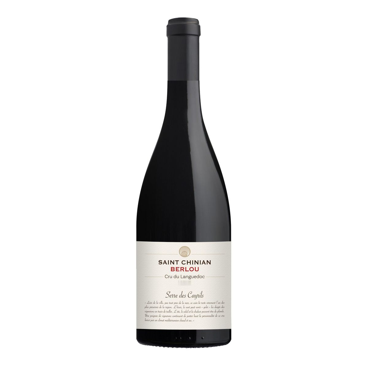 Dégustation : Ce Saint-Chinian Berlou "Serre des Cayrils" développe des fruits noirs, des épices, de la garrigue et des notes de sous-bois. La bouche est puissante, équilibrée et dotée de tanins fermes, avec une longue finale. L’ensemble est structuré et expressif. Sa robe rouge rubis profond évolue vers le grenat.