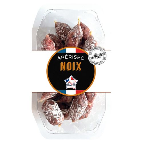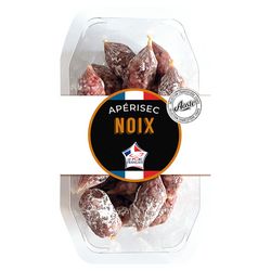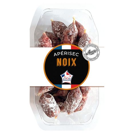 Ingrédients : Viande de porc (origine France), NOIX (14%), sel, LACTOSE, dextrose, épices, conservateur : nitrite de sodium; ferments. Enveloppe : collagène. Présence possible d’autres fruits à coques. 145 g de viande utilisés pour la préparation de 100 g de produit fini. Valeurs énergétiques et nutritionnelles moyennes pour 100g