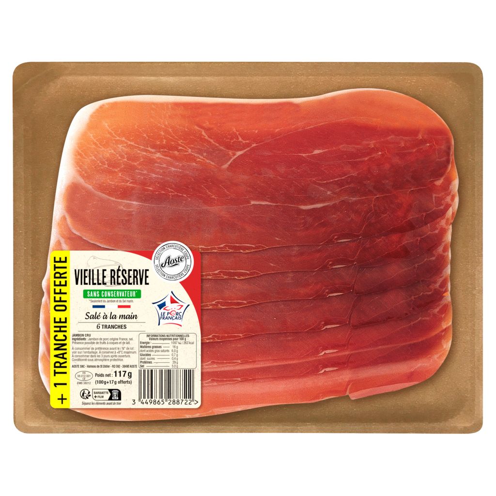 Retrouvez l'authenticité du Jambon Vieille Réserve Aoste, prêt à déguster en version 6 tranches fines + 1 gratuite. Une texture fondante en bouche, et un goût délicat. Le Vieille Réserve Aoste, raffiné et équilibré.