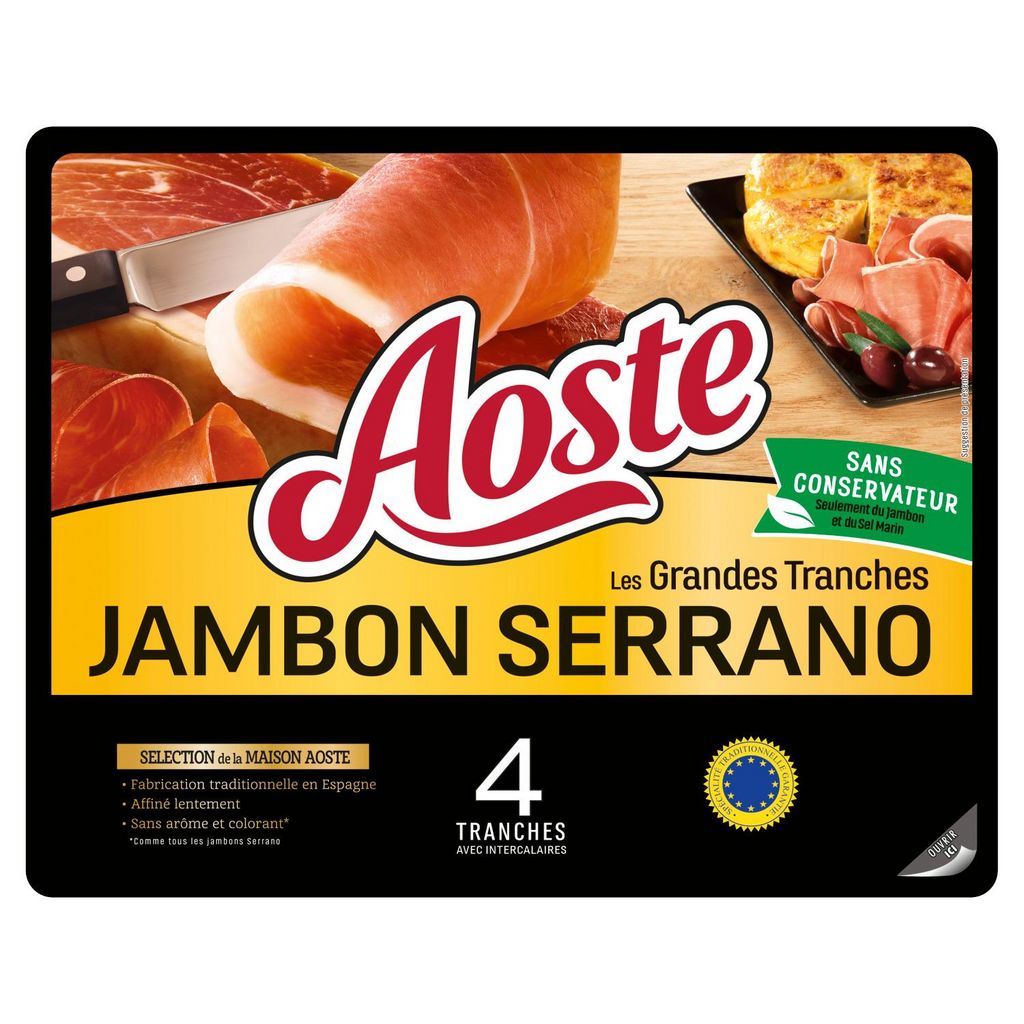 Le jambon Serrano Aoste est tranché selon le savoir-faire traditionnel espagnol pour offrir à votre table authenticité et raffinement au quotidien.