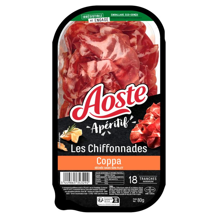 Ingrédients : Echine de porc origine UE, sel, dextrose, sirop de glucose, arômes naturels, épices, sucre, conservateurs : lactate de sodium, acétates de sodium, acide ascorbique, ascorbate de sodium, nitrate de potassium et nitrite de sodium, ferments. Présence possible de soja, lait et fruits à coques.