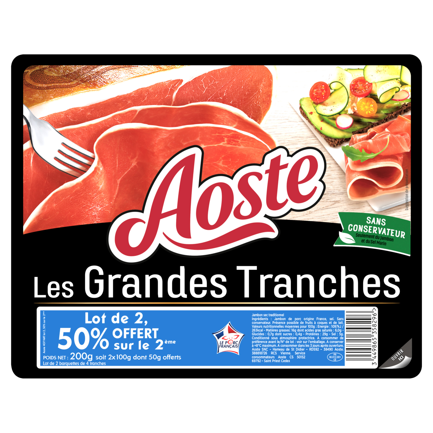 Ingrédients : Jambon de porc origine France, sel. Présence possible de fruits à coques et de lait.