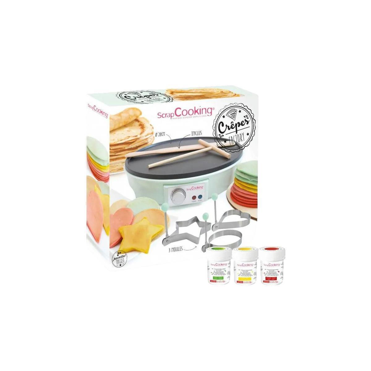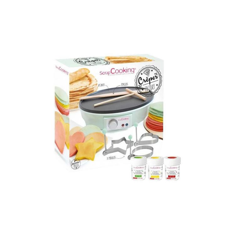 Découvrez la crépière électrique APC, idéale pour la préparation de crêpes colorées grâce à ses 3 moules fantaisie (étoile, cœur, rond) et ses 3 colorants alimentaires concentrés en jaune, vert et rouge. Avec une puissance de 1000 watts et une plaque de cuisson de 28 cm de diamètre, cet appareil fac