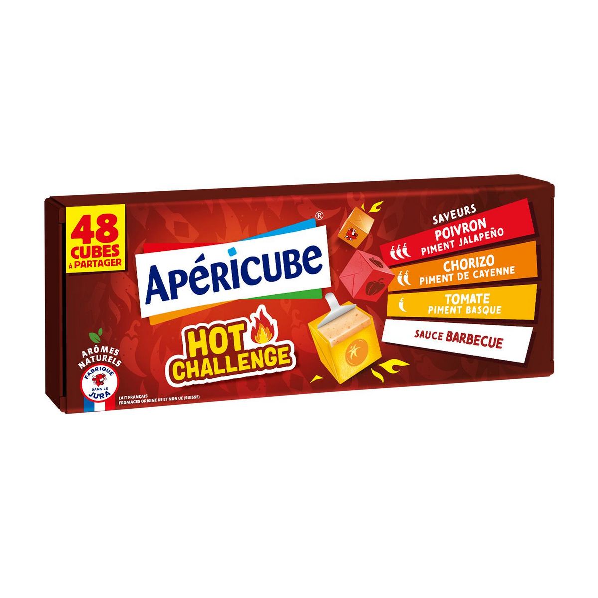 "Apéricube Hot Challenge, l'incontournable de l'apéritif, avec ses 48 cubes fromagers savoureux en portions. Un crescendo de saveurs épicées pour les amateurs de sensations fortes : saveurs Poivron Piment Jalapeno, Chorizo Piment de Cayenne, Tomate Piment Basque, Sauce Barbecue, font grimper la température à l'apéro ! Nos recettes, élaborées avec des arômes naturels, sont fabriquées en France*, dans nos fromageries du Jura ! Variez les goûts et les ambiances, découvrez aussi plus de 30 saveurs à déguster dans la gamme. Et découvrez ApériQuiz, un jeu caché à l'intérieur des cubes, avec plus de 900 questions inédites pour animer vos apéros ! *Lait français – Fromages origine UE et non UE (Suisse)"