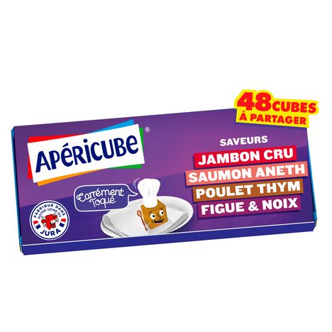 Régalez-vous avec le fromage apéritif Apéricube Carrément Toqué et ses petits cubes fromagers 3 étoiles, onctueux et variés, goûts Jambon cru, Saumon aneth, Poulet thym, Figue noix pour des apéros haut en couleurs. Pour un apéritif fabriqué en France dans nos usines du Jura, sans conservateur, sans colorant ni d'arômes artificiels ajoutés.