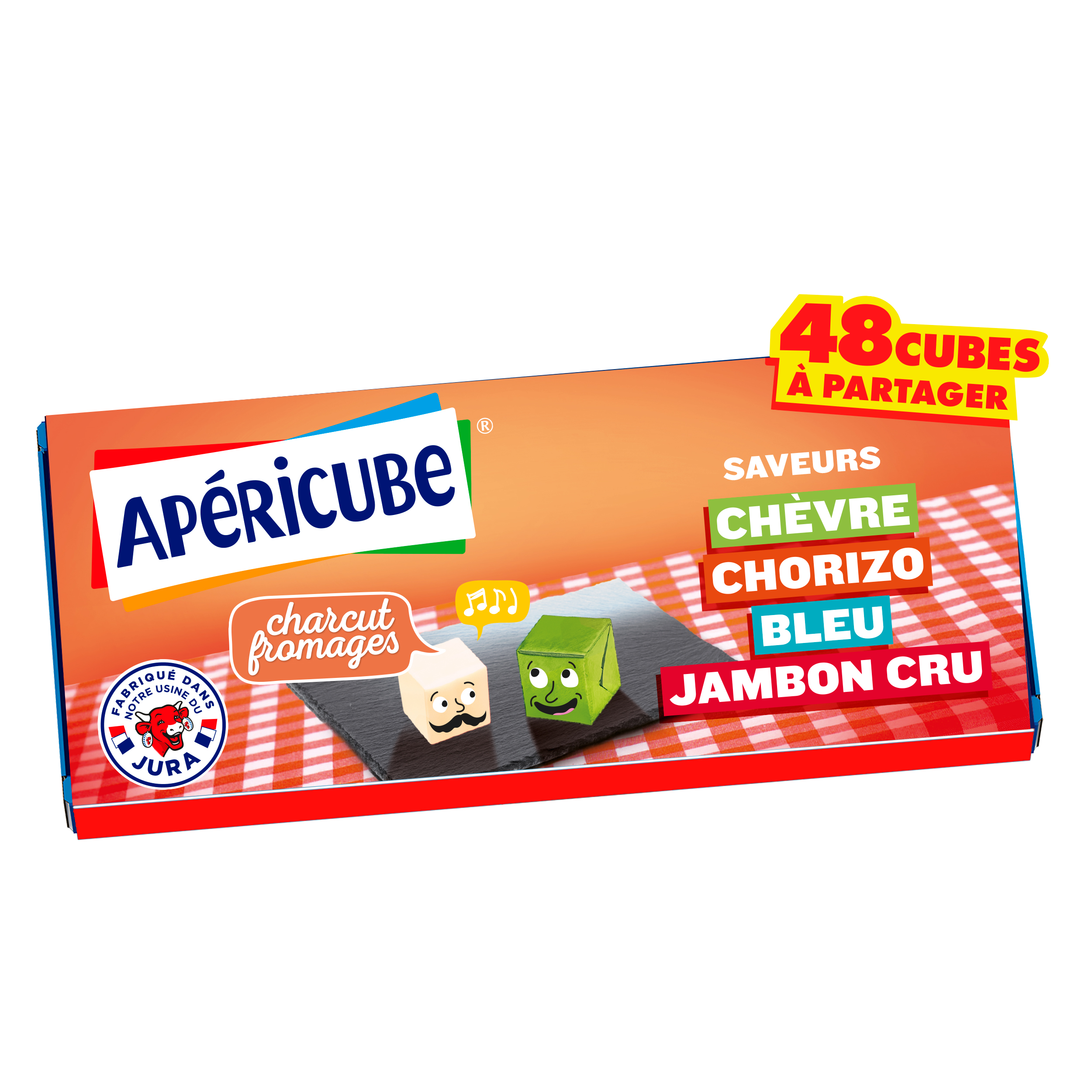 Le fromage apéritif Apéricube Charcut' Fromage, ce sont des petits cubes fromagers onctueux et gourmands, goûts Chèvre, Chorizo, Bleu et Jambon cru, qui garniront parfaitement tous vos apéros ! Pour un apéritif fabriqué en France dans nos usines du Jura, sans conservateur, sans colorant ni arômes artificiels ajoutés.