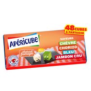 LAIT écrémé réhydraté (origine : France), FROMAGES (dont 13% de CHÈVRE dans les cubes Chèvre et 13% de BLEU dans les cubes Bleu), BEURRE, sels de fonte (polyphosphates), concentré LACTIQUE LAITIER, protéines de LAIT, arôme naturel de fromage (LAIT DE CHÈVRE) dans les cubes Chèvre, arômes naturels (paprika fumé) dans les cubes Chorizo et Jambon cru, sel.