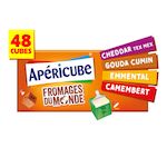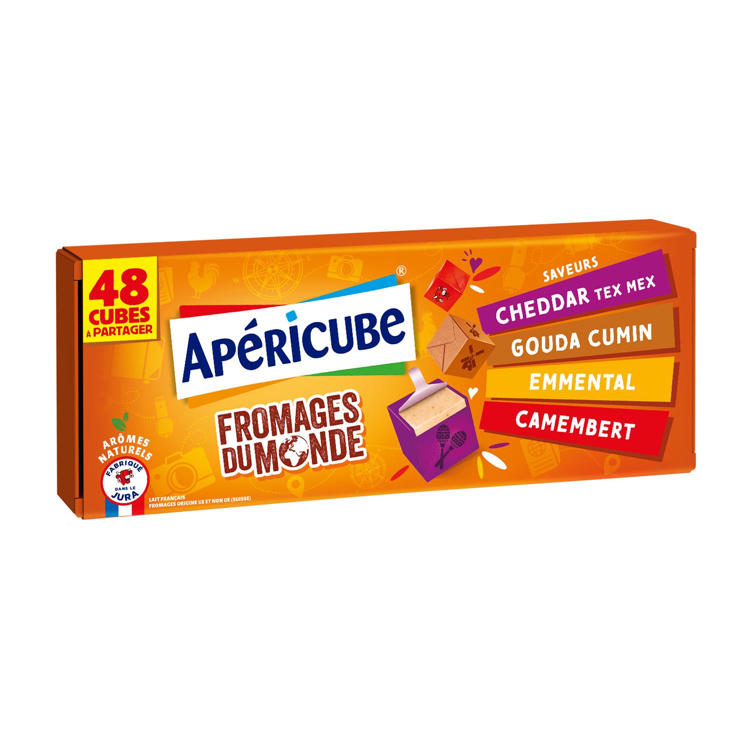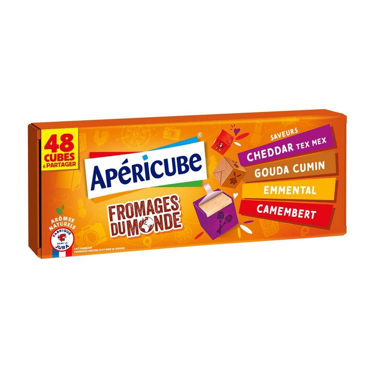 "Apéricube Fromages du monde, l'incontournable de l'apéritif, avec ses 48 cubes fromagers savoureux en portions. Un tour du monde fromager haut en couleurs avec les saveurs Cheddar Tex Mex, Gouda Cumin, Emmental, Camembert. Nos recettes, élaborées avec des arômes naturels, sont fabriquées en France*, dans nos fromageries du Jura ! Variez les goûts et les ambiances, découvrez aussi plus de 30 saveurs à déguster dans la gamme. Et découvrez ApériQuiz, un jeu caché à l'intérieur des cubes, avec plus de 900 questions inédites pour animer vos apéros ! *Lait français – Fromages origine UE et non UE (Suisse)"