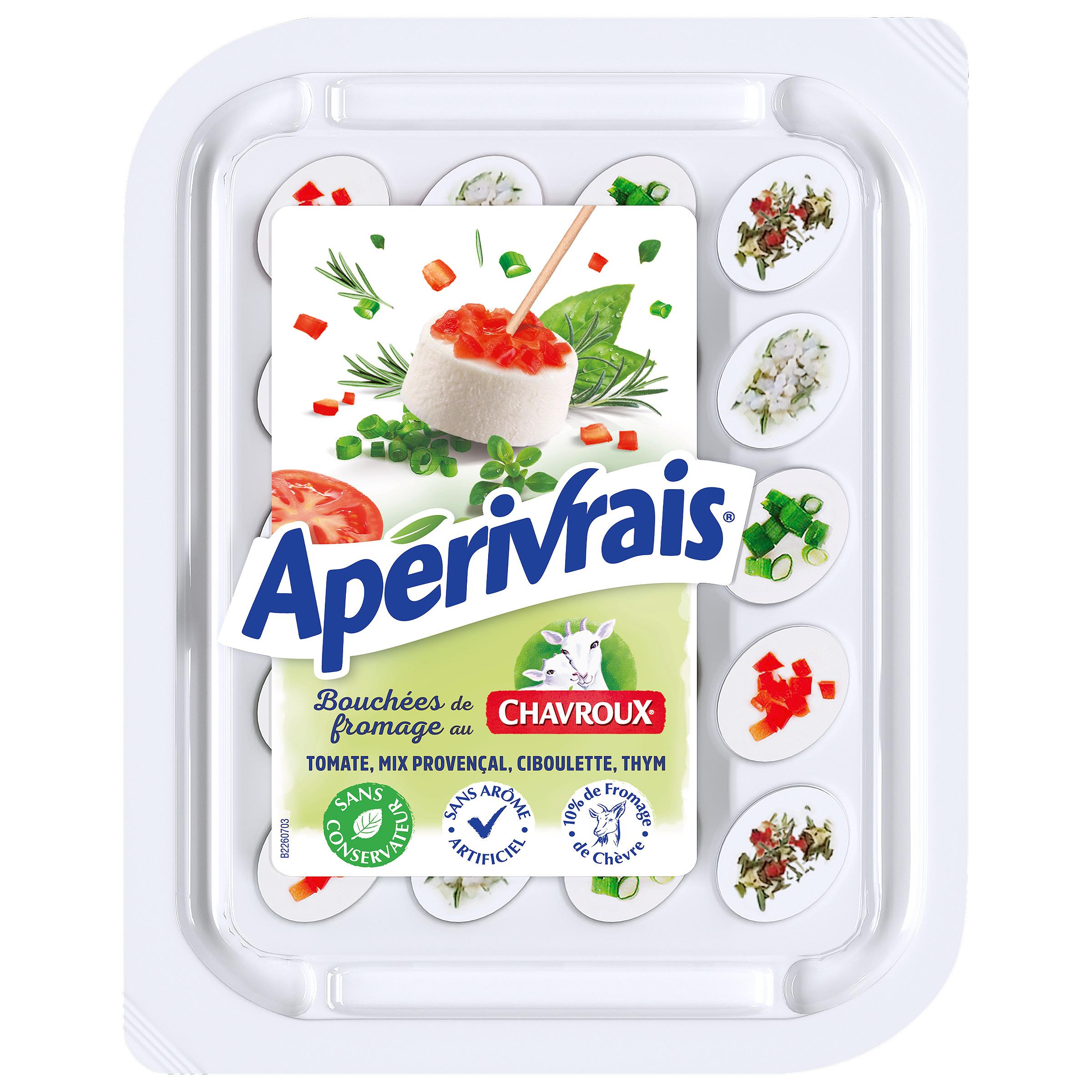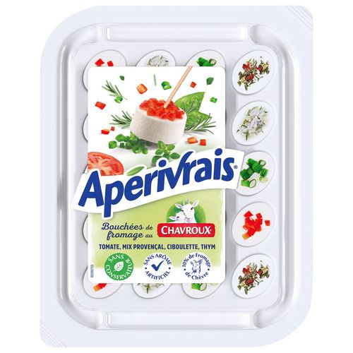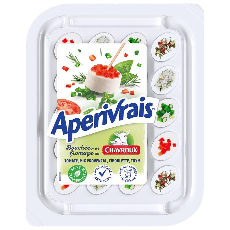 Ingrédients : Ingrédients du fromage: LAIT DE VACHE (Origine France), CRÈME DE LAIT DE VACHE, LAIT DE CHÈVRE et CRÈME DE LAIT DE CHÈVRE 10% (origine: France et Espagne), sel, ARÔME NATUREL DE LAIT ET CREME DE CHÈVRE, ferments lactiques. Ingrédients sur le fromage (en quantité variable) : Thym, tomate, basilic, poivron, ciboulette. Fabriqué dans un atelier utilisant des fruits à coque