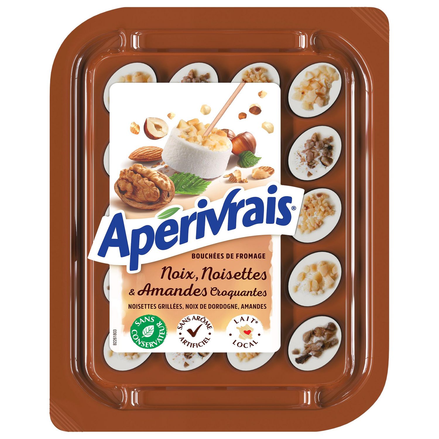 APV NOIX: Fromage au lait de vache pasteurisé, aromatisé saveur noix, et agrémenté de noix, noisettes et amandes.