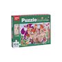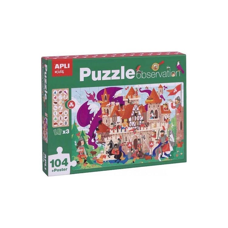 Puzzle de 104 pieces avec une jolie scene chevaleresque. 104 pièces pour un puzzle fini de 41,5 x 64,5 cm. Avec 3 fiches d'élèments à localiser dans le puzzle, un chouette jeu d'observation. A partir de 5 ans