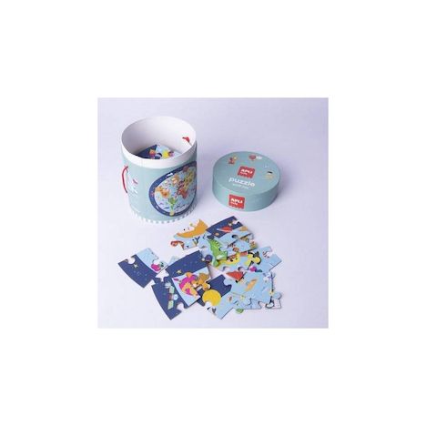 Puzzle de 20 pièces pour réaliser un puzzle rond sur le planisphère. Le tout dans une jolie boite de rangement à anse.