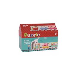 Puzzle dans une boîte maisonnette en carton décorée sur le thème du train. Produit très résistant et avec des finitions de grande qualité , en carton gris de 2 mm contre collé de. deux feuilles blanches de 250 g. Impression couleur. Ce puzzle permet de constituer un train de 2 mètres.